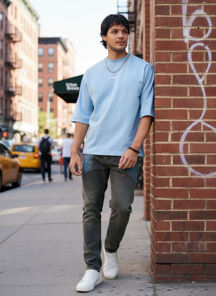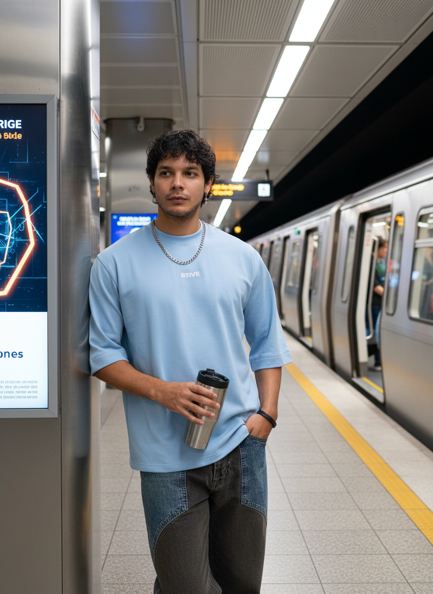Welcome to the oversized era. This tee is cut in a deliberately slouchy, wide fit with a unique three-quarter sleeve, giving it a drop-shoulder silhouette that hangs perfectly. The Icy-Blue wash channels a clean, street-ready energy, while the minimalist B5IVE logo is cleanly stamped at the chest. Crafted from thick, breathable cotton, this is the anti-fit staple built for comfort and statement. Pair this 'Sky-Drift' Tee with any B5IVE utility denim (like the ones shown) for a powerful, flowing street ensemble.
